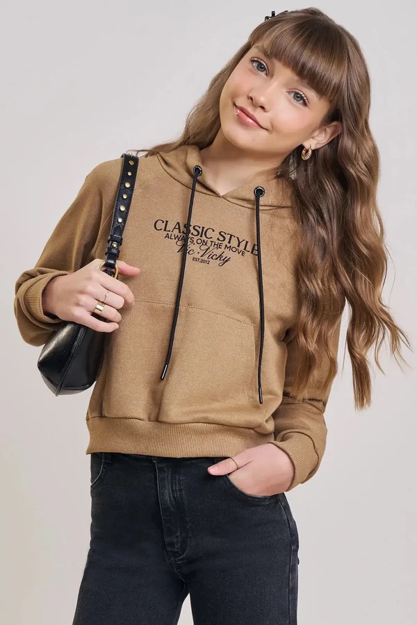 O blusão boxy com capuz em moletom diferenciado sem pelúcia, é a escolha perfeita para as meninas que amam um look cheio de conforto, sem abrir mão do estilo no dia a dia! Disponível na cor bege escuro - ela é uma peça essencial, perfeita para montar diversos looks e deixar o inverno das girls ainda mais estiloso. A estampa divertida, adiciona um charme especial à peça.